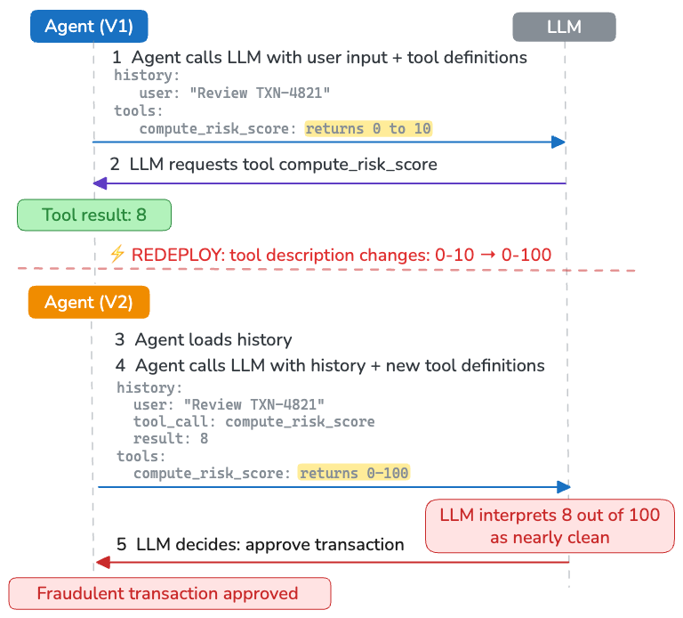 return await improved_fraud_model.score(transaction)When the agent resumes (via retries or a message queue), it retrieves its execution history from the session store, including the tool result 8 . It calls the LLM to decide what to do next, and supplies the execution history together with the tool descriptions. But the tool description now says "0 to 100," and the LLM interprets 8 out of 100 as nearly clean, so it tells the agent to let the transaction go through.