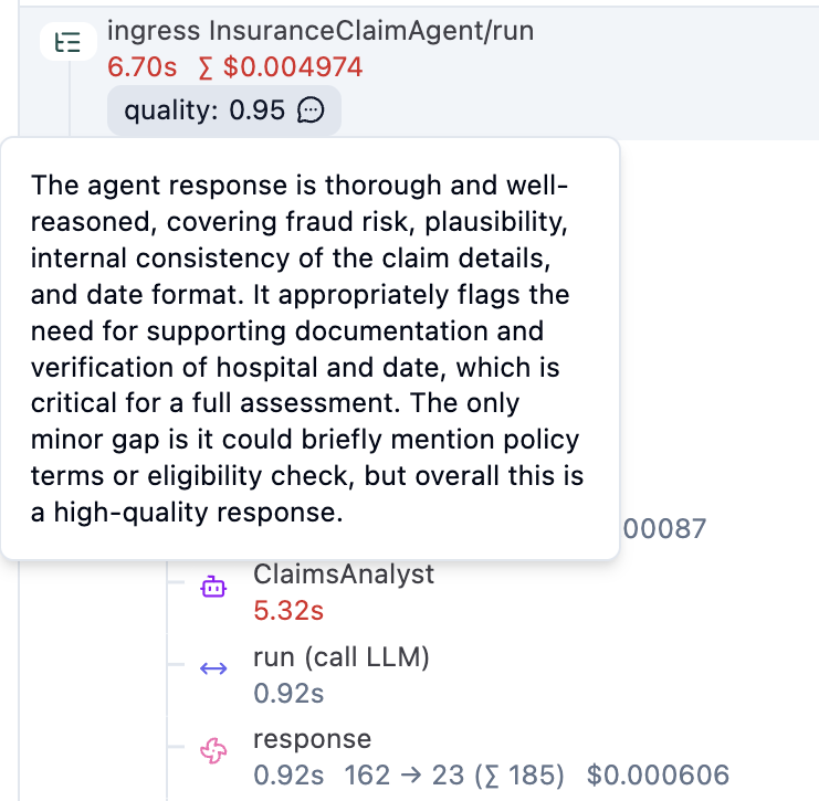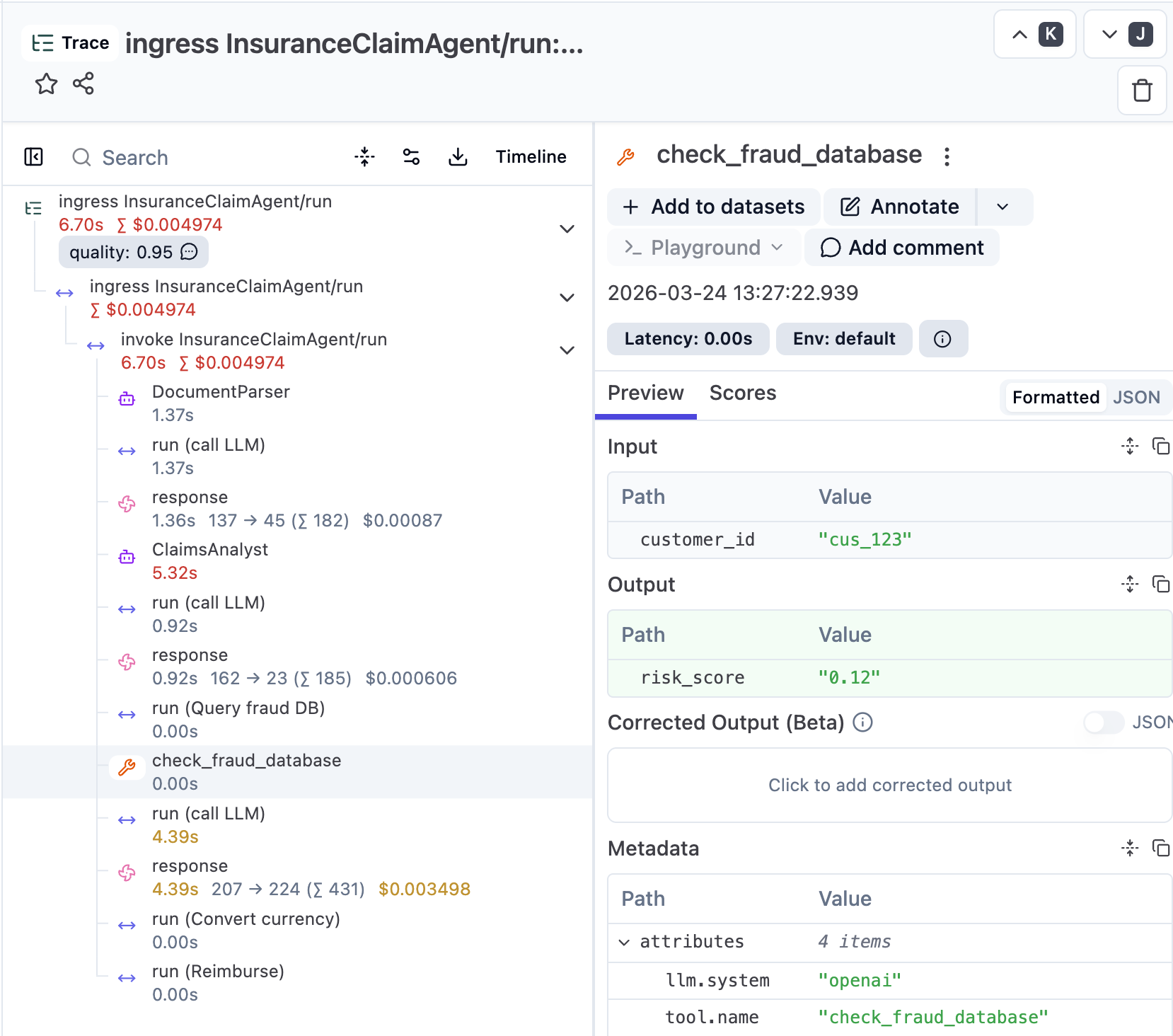Our agent is now resilient to failures, but when a claim gets rejected unexpectedly, or a reimbursement amount looks wrong, you need to be able to understand what happened. This is where Langfuse comes in: it captures detailed traces of AI actions and metadata, giving you visibility into what happened inside each execution.