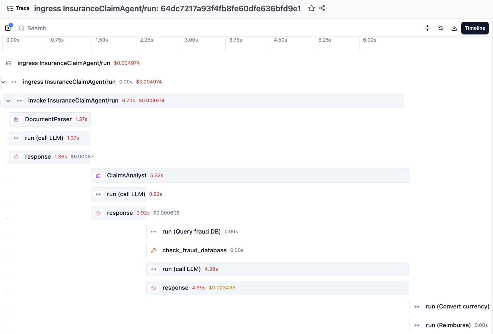 The result is a single trace that covers everything from request intake to final reimbursement: