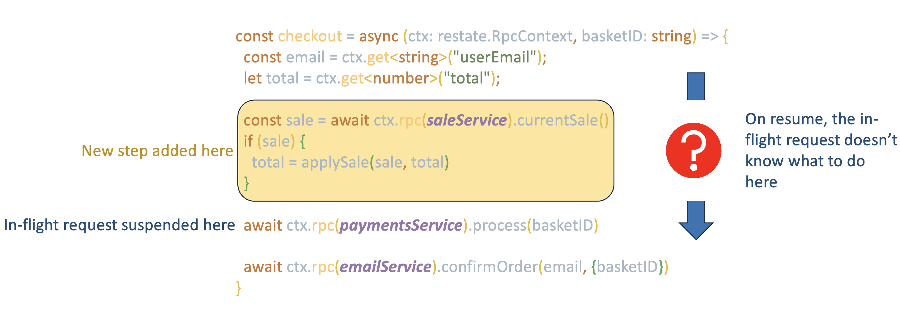 This is the immutability problem; the code executing a given request must never change in its behaviour, despite the potential for requests to be replayed long after they started.